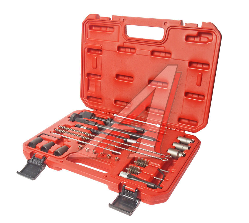 Комплектация Съёмник уплотнительных шайб; Направляющая для чистки седла форсунки; Переходная втулка – 3 шт.; Шестигранный ключ – 2 шт. Фреза 0°, Ø19 мм, 17 мм, 15 мм со ступенчатым профилем зуба – 3 шт.; Удлиненные ершики для чистки колодцев – 2 шт.; Короткие ершики для чистки колодцев – 2 шт.; Направляющая гибкая; Адаптер для коротких ершиков; Металлическая шпилька с резьбой; Заглушки – 5 шт. Описание Оптимальный комплект для восстановления и очистки посадочных мест форсунок. Применение Применяется для ремонта посадочных мест форсунок BOSCH и DELPHI двигателей HDI, дизельных двигателей с прямым впрыском топлива и двигателей с системой Common Rail.