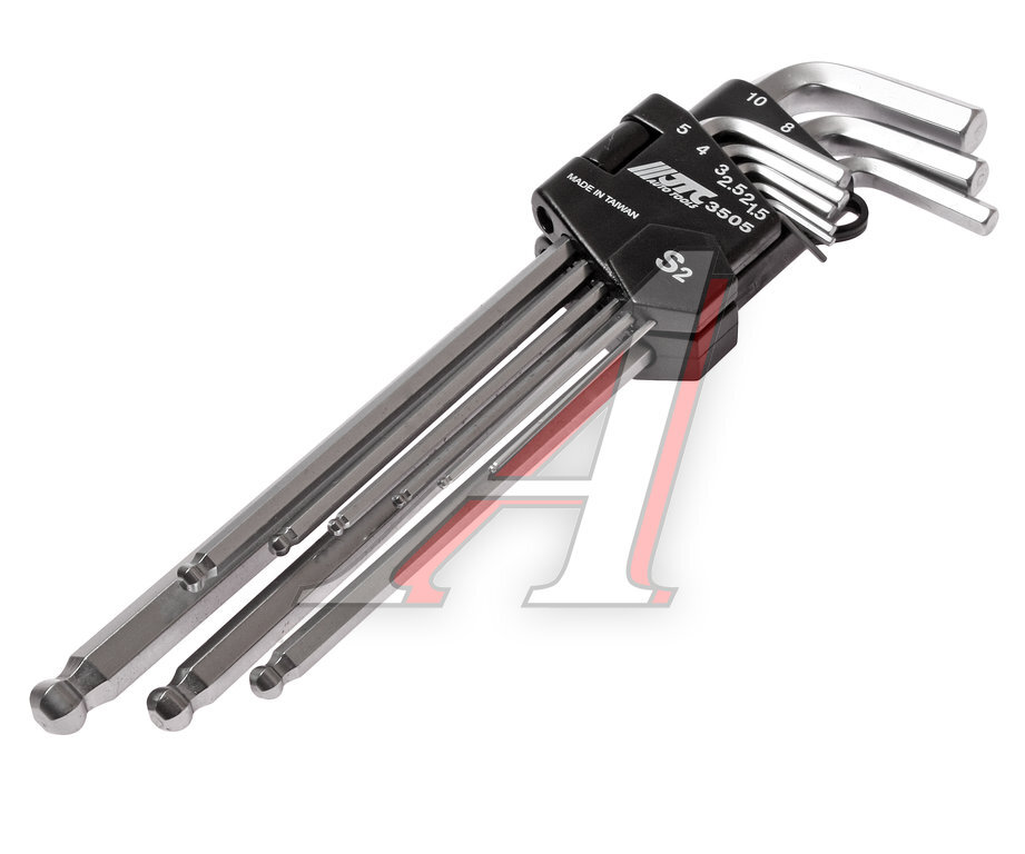 Ключ шестигранный удлиненный с шаром набор 9 предметов JTC Описание Применяется в местах, где затруднен прямой доступ. Специальная конструкция с шаровидным наконечником позволяет использовать инструмент под небольшим углом в труднодоступных местах. Длинную часть ключа можно использовать при любой глубине отверстий. Материал: S2. Размер: 1.5, 2, 2.5, 3, 4, 5, 6, 8, 10 мм. Количество в оптовой упаковке: 6 шт. и 36 шт. Габаритные размеры: 335/95/30 мм. (Д/Ш/В) Вес: 464 гр.
