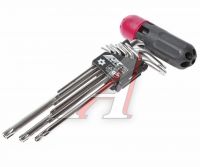 Инструмент изготовлен из стали марки SNCM8660. Длинная часть ключа предназначена для работы в труднодоступных местах, а также служит для увеличения крутящего момента. Кроме того, длинная часть - с отверстием. В комплекте: ключи TORX Г-образные - T10H, 15H, 20H, 25H, 27H, 30H, 40H, 45H, 50H. Количество в оптовой упаковке: 6 шт. и 24 шт. Габаритные размеры: 340/140/40 мм. (Д/Ш/В) Вес: 540 гр.