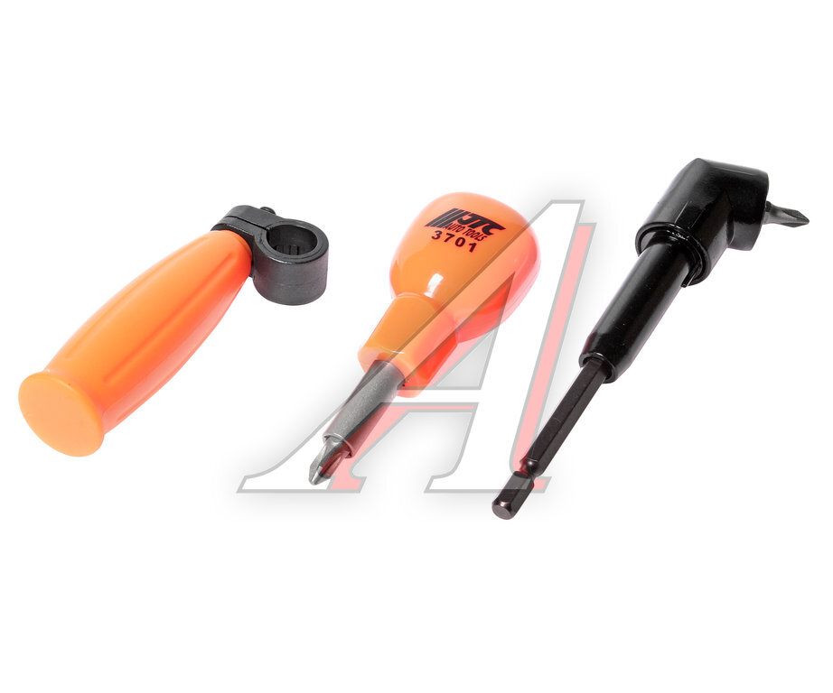 Отвертка с угловым переходником 90 градусов с набором бит JTC Описание Идеально подходит для выполнения работ в условиях ограниченного пространства. В комплект входит быстросъемная рукоятка, которая позволяет удерживать инструмент под необходимым углом, что повышает эффективность работы. Кроме того, в комплекте шестигранный хвостик 1/4", который может применяться с ручным или механическим приводом. Также в комплекте биты PH1 и PH2, длиной 25 мм. Габаритные размеры: 200/100/30 мм. (Д/Ш/В) Вес: 247 гр.
