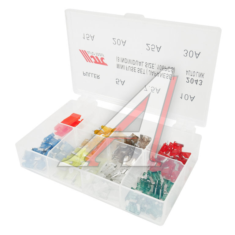 В комплекте: Размеры: 5 А, 7.1 А, 10 А, 15 А, 20 А, 25 А, 30 А х15 шт. каждого размера. Съемник - 1 шт. Всего: 105 шт. Упаковка: прочный пластиковый бокс с ячейками. Габаритные размеры:135/85/35 мм. (Д/Ш/В) Вес: 100 гр.