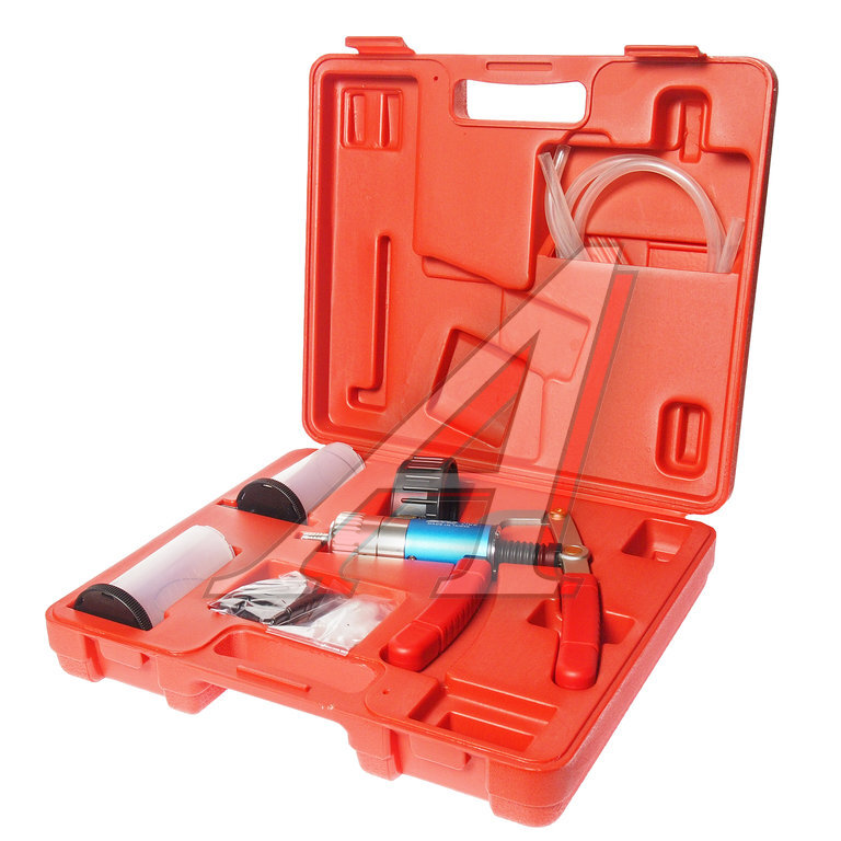 Комплектация Пистолет для измерения давления - 1 шт. Прозрачная трубка - 6 шт. Прозрачная емкость (120 мл.) - 2 шт. Насадки - 18 шт. Описание Предназначен для проведения обследования на предмет выявления проблем с давлением и герметичностью. Тестер позволяет создавать разрежение и давление при проведении проверок различных вакуумных или пневматических актюаторов и датчиков. Универсальный вакуумный тестер является многофункциональным прибором и может использоваться в различных системах автомобиля. В комплект входят разные виды соединений, что позволяет проводить диагностику на автомобилях большинства марок. В комплекте предусмотрены клапаны для прокачки тормозной системы. Предоставляет возможности тестировать 2 режима давления. Вакуумметр также может применяться в качестве измерителя разрежения во впускном коллекторе двигателя и различных точках вакуумных систем. Вакуумный тестер может использоваться для откачки эксплуатационных жидкостей за счет вакуумирования, а также для опрессовки систем охлаждения двигателя. Технические характеристики Диапазон положительного давления:. 0-4 бар/0-60 psi (1-4 дюйм/г.) Диапазон отрицательного давления (разряжения): 0 -1 бар/0-30 psi (1-1 дюйм/г.) Важные рекомендации Избегайте полного заполнения пистолета тех. жидкостями. Это может привести к его поломке. Для этого при работе никогда не заполняйте емкость на 100% - визуально отслеживайте уровень наполнения с помощью шкалы находящейся на емкости.