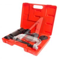 Комплектация Струбцина усиленной конструкции — 1 шт. Адаптеры для монтажа/демонтажа — 5 шт. Насадки — 3 шт. Описание Предназначен для снятия/установки запрессованных элементов: шаровых опор, карданного шарнира с крестовиной, анкерных пальцев барабанных тормозов и других аналогичных работ. Применение Размер струбцины: 165 мм. Размер насадок: 69 мм, 56 мм, 45 мм. Важные рекомендации ПРЕДУПРЕЖДЕНИЕ. При установке не повредите защитный чехол шаровой опоры. Поврежденный чехол обязательно замените.