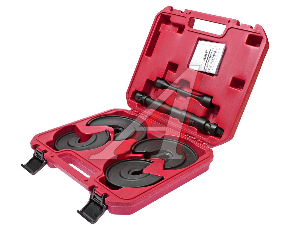 Стяжка пружин Комплектация Вал с регулируемой длиной - 1 шт. Длина 290 мм. Материал хроммолибденовая сталь. Цвет черный. Ход штока 95-220 мм. Диаметр вала 29 мм. Вес 732 гр. Переходник - 1 шт. Длина 180 мм. Материал сталь марки SCM440. Цвет черный. Ход штока 95-220 мм. Диаметр вала 1/2" мм. Вес 248 гр. Захваты, размер большой - 2 шт. Длина 150 мм. Обработка ковка. Толщина мин/макс: 18/28 мм. Материал цинк. Угол захвата 90°. Вес 998 гр. Захваты, размер малый - 2 шт. Длина 130 мм. Обработка ковка. Толщина мин/макс: 18/28 мм. Материал цинк. Угол захвата 90°. Вес 653 гр. Описание Запатентованный. Пара уникальных захватов плотно фиксирует пружину, обеспечивая высокую надежность и легкость во время работ. Возможно применение с пневмоприводом. Все работы выполняются прямо на автомобиле. Подходит для большинства моделей автомобилей. Технические характеристики Подходит только для небольших диаметров, менее 30 мм. Переходник обеспечивает усилие 100 Н·м. Точка разрыва: 9,500 kgf = 93,100 N. Максимальные нагрузки: 3,800 kgf = 37,240 N. Особенности патента В запатентованной конструкции захватов предусмотрены 5 точек, с помощью которых происходит плотная фиксация к валу. Благодаря этому обеспечивается высокая надежность и легкость во время проведения работ по стяжке пружин. Применение Chrysler, Chevrolet, Citroen, Ford, Honda, Hyundai, Kia, Mazda, Mitsubishi, Peugeot, Renault, Skoda, Suzuki, Toyota, Volvo, VW, BMW 3 Series, Mercedes Benz W202, W204
