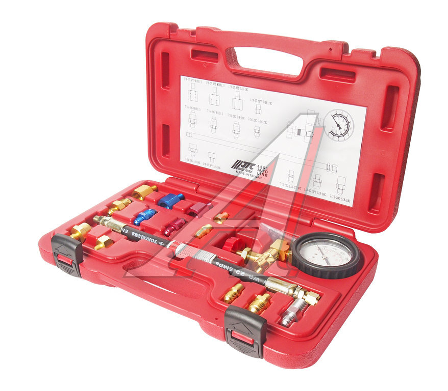 Комплектация Манометр с клапаном. Шкала измерения до 2000 PSI (140 бар) – 1 шт. Соединительный шланг – 1 шт. Адаптеры – 13 шт. Комплект прокладок. Описание Тестер предназначен для замера давления масла в системе гидроусилителя. Позволяет выявить различные неполадки в работе системы ГУР, а также утечки технической жидкости. Позволяет сэкономить рабочее время и быстро определять проблемные места. Применение Подходит для большинства марок автомобилей.