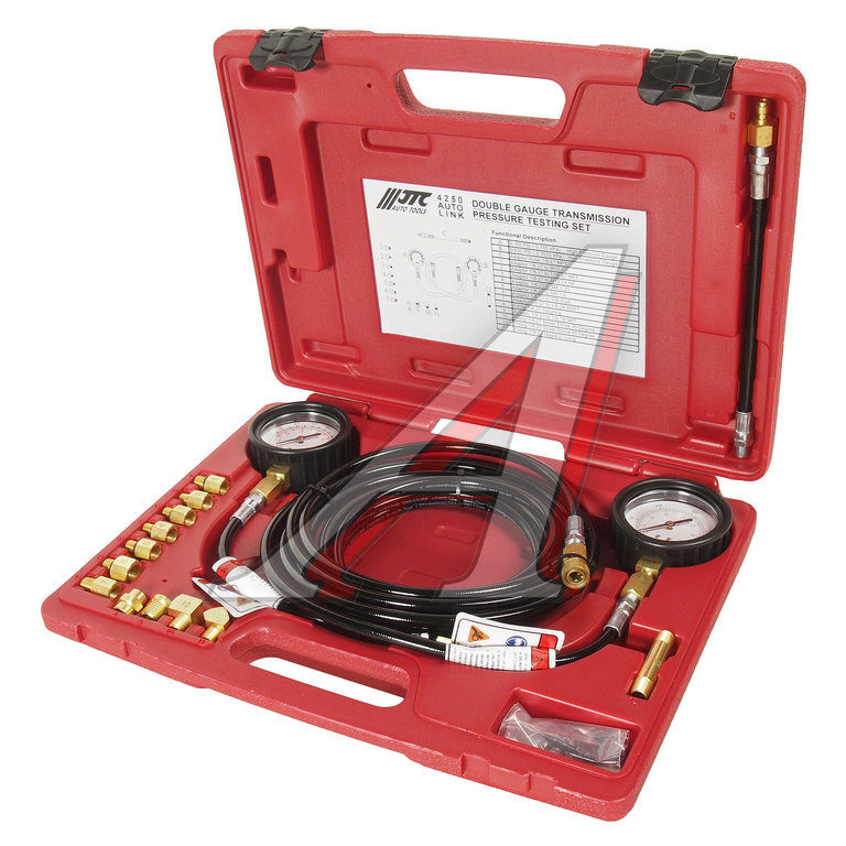 Комплектация Манометр для низких значений - 0-100 PSI (0-700 kPa), с гибким удлинителем и быстроразъемным соединением; Манометр для высоких значений - 0-500 PSI (0-3500 kPa), с гибким удлинителем и быстроразъемным соединением; Шланг 1/8-27 NPT; Переходник 1/8-27 для М10-1.0; Переходник 1/8-27 для 1/16-27 NPT; Переходник 1/8-27 для 5/16-24 NF; Переходник 1/8-27 для M8-1.25; Переходник 1/8-27 для M8-1.0; Переходник 1/8-27 для VW/Audi; Переходник 1/8-27 для 1/8-28 BSPT; Специальный фитинг 1/8-27; Переходник 1/8-27 для 1/4-18 NPT; Специальный фитинг 1/8-27, угол наклона 90°; Специальный фитинг 1/8-27, угол наклона 45°; Специальный фитинг 1/8-27, угол наклона 90°, длина 5 см, удлиненный; Комплект уплотнительных колец Описание Тестер предназначен для измерения и проверки давления рабочей жидкости (трансмиссионного масла) в автоматических коробках передач в двигателях легковых и грузовых автомобилей. Набор представляет собой тестер для замера давления ATF в АКПП большинства автоматических трансмиссий, таких как ZF, AISIN WARNER, HYDRA MATIC и др. В комплект входят четыре специальных приспособления (угловые фитинги), которые обеспечивают доступ в труднодоступные места КПП под углом 45 и 90 градусов. Большой ассортимент адаптеров и два манометра позволяют проводить тестирование для большинства КПП различных марок автомобилей. Также может применяться для проверки тормозной системы и ABS. Манометры в защитном резиновом кожухе. Применение Большинство марок автомобилей.