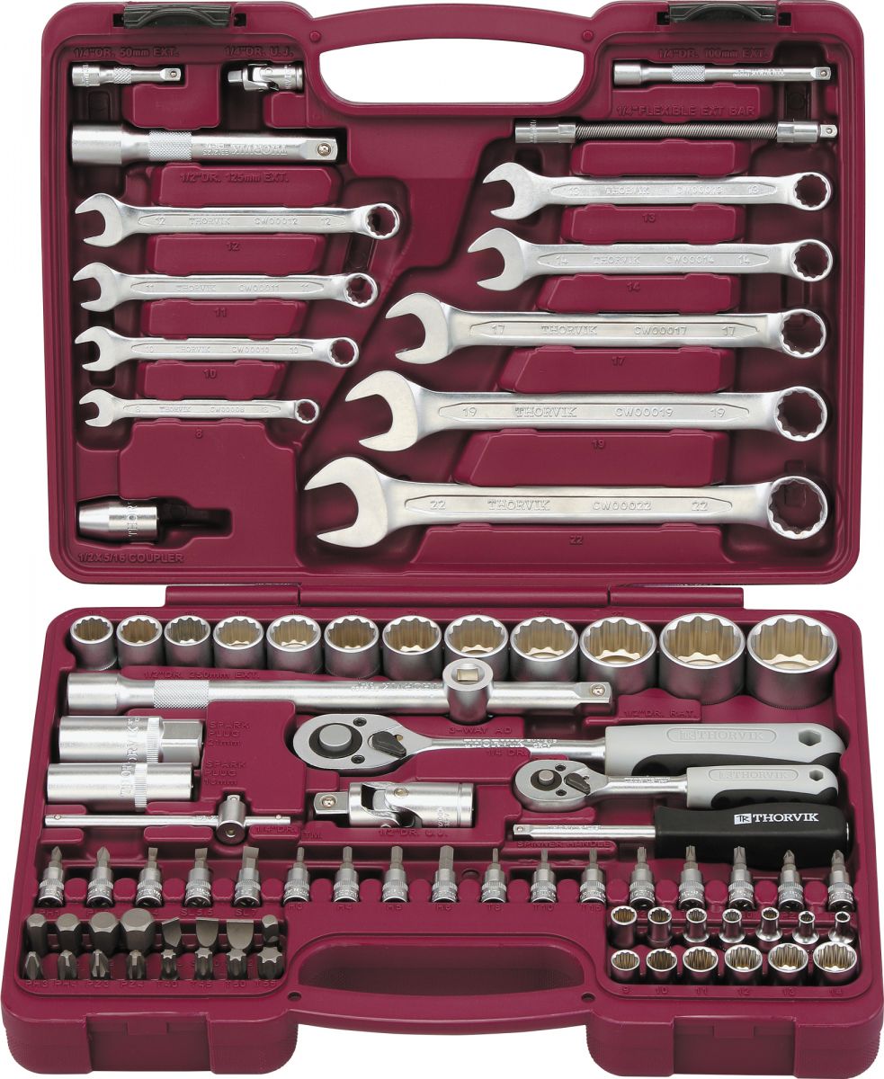 Состав: 1/4"DR ГОЛОВКИ ТОРЦЕВЫЕ, 12-гр. 1/4"DR 13 шт.: 4, 4.5, 5, 5.5, 6, 7, 8, 9, 10, 11, 12, 13, 14 мм ТРЕЩОТОЧНАЯ РУКОЯТКА: 1/4"DR ВОРОТОК Т-ОБРАЗНЫЙ: 1/4"DR ШАРНИР КАРДАННЫЙ: 1/4"DR УДЛИНИТЕЛИ 1/4"DR, 2 шт.: 50, 100 мм ГИБКИЙ УДЛИНИТЕЛЬ 1/4"DR: 150 мм ОТВЕРТОЧНАЯ РУКОЯТКА: 1/4"DR НАСАДКИ СО ВСТАВКИ-БИТЫ, 17 шт.: (РН) 1, 2; (PZ) 1, 2;(H) 3, 4, 5, 6 мм; (SL) 4, 5.5, 7 мм;(T)Т8, Т10, Т15, Т20, Т25, Т30 1/2"DR ГОЛОВКИ ТОРЦЕВЫЕ 12-гр. 1/2"DR, 12 шт.: 14, 15, 16, 17, 18, 19, 21, 22, 24, 27, 30, 32 мм ГОЛОВКИ СВЕЧНЫЕ 1/2"DR, 2 шт.: 16, 21 мм ТРЕЩОТОЧНАЯ РУКОЯТКА: 1/2"DR УДЛИНИТЕЛИ 1/2"DR, 2 шт.: 125, 250 мм ШАРНИР КАРДАННЫЙ: 1/2"DR АДАПТЕР ТРЕХСТОРОННИЙ: 1/2"DR АДАПТЕР ДЛЯ БИТ: 1/2"DR х 5/16” ВСТАВКИ-БИТЫ 5/16” HDR L=30 мм, 15 шт.: (РН) 3, 4; (PZ) 3, 4; (T) Т40, Т45, Т50, Т55; (SL) 8, 10, 12 мм; (H) 8, 10, 12, 14 мм КЛЮЧИ КОМБИНИРОВАННЫЕ, 9 шт.: 8, 10, 11, 12, 13, 14, 17, 19, 22 мм
