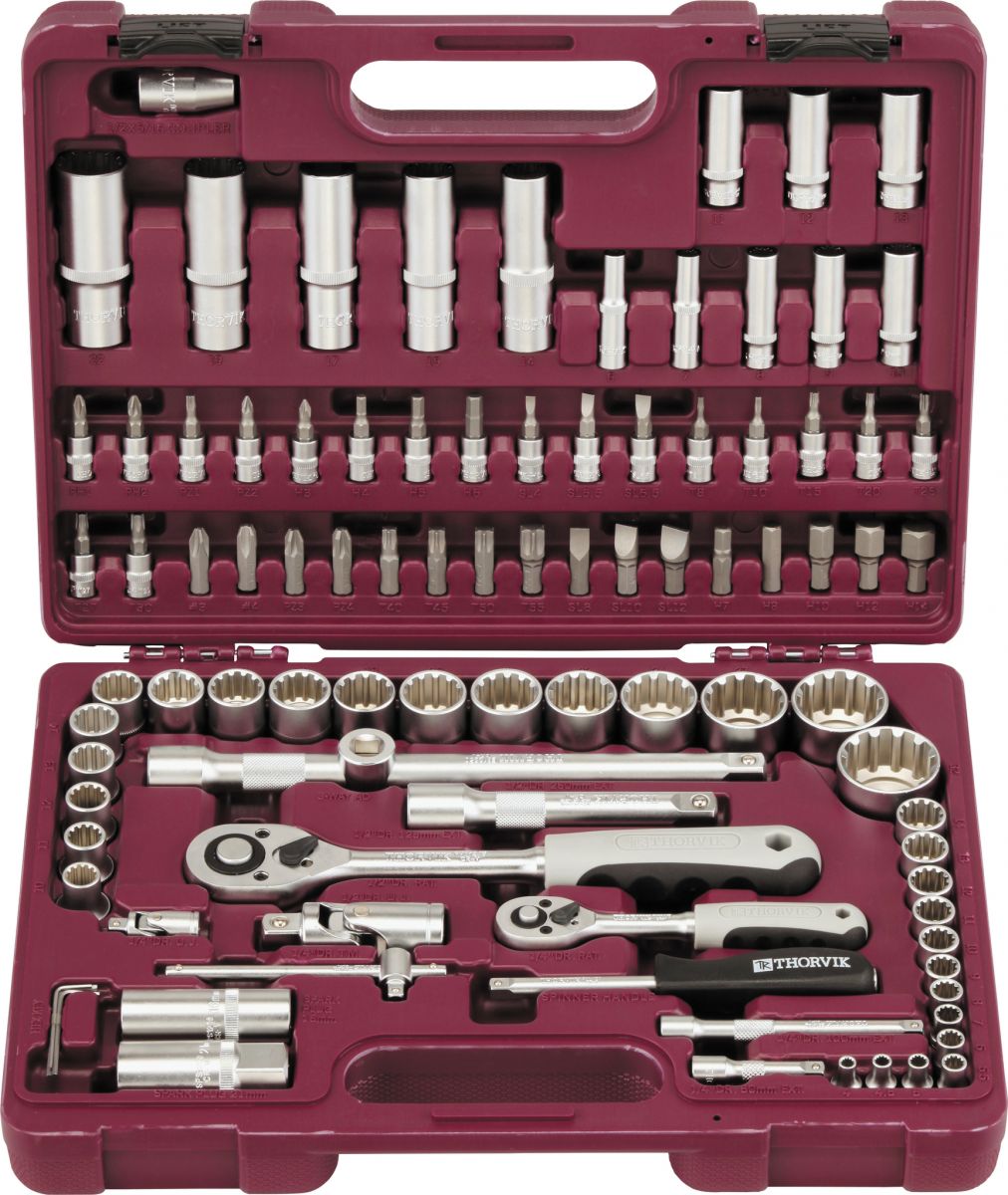 Состав: 1/4"DR ГОЛОВКИ ТОРЦЕВЫЕ MultiProf 1/4"DR, 13 шт.: 4, 4.5, 5, 5.5, 6, 7, 8, 9, 10, 11, 12, 13, 14 мм ГОЛОВКИ ТОРЦЕВЫЕ ГЛУБОКИЕ MultiProf 1/4"DR, 8 шт.: 6, 7, 8, 9, 10, 11, 12, 13 мм ТРЕЩОТОЧНАЯ РУКОЯТКА: 1/4"DR ШАРНИР КАРДАННЫЙ: 1/4"DR ВОРОТОК Т-ОБРАЗНЫЙ : УДЛИНИТЕЛИ 1/4"DR 2 шт.: 50 и 100 мм ОТВЕРТОЧНАЯ РУКОЯТКА: 1/4"DR НАСАДКИ С ВСТАВКАМИ 1/4"DR, 12 шт.: (РН) 1, 2; (PZ) 1, 2; (H) 3, 4, 5, 6 мм; (SL) 4, 5.5, 6.5;(T) Т8, Т10, Т15, Т20, Т25, Т27, Т30 1/2"DR ГОЛОВКИ ТОРЦЕВЫЕ MultiProf 1/2"DR, 17 шт.: 10, 11, 12, 13, 14, 15, 16, 17, 18, 19, 20, 21, 22, 24, 27, 30, 32 мм ГОЛОВКИ ТОРЦЕВЫЕ ГЛУБОКИЕ MultiProf 1/2"DR, 5 шт.: 14, 15, 17, 19, 22 мм ГОЛОВКИ СВЕЧНЫЕ 1/2"DR, 2 шт.: 16, 21 мм ТРЕЩОТОЧНАЯ РУКОЯТКА: 1/2"DR ШАРНИР КАРДАННЫЙ: 1/2"DR УДЛИНИТЕЛИ 1/2"DR, 2 шт.: 125 и 250 мм АДАПТЕР ТРЕХСТОРОННИЙ: 1/2"DR АДАПТЕР ДЛЯ БИТ: 1/2"DR х 5/16” ВСТАВКИ-БИТЫ 5/16” HDR L=30 мм, 16 шт.: (РН) 3, 4; (PZ) 3, 4; (T) Т40, Т45, Т50, Т55;(SL) 8, 10, 12 мм;(H) 7, 8, 10, 12, 14 мм КЛЮЧИ ТОРЦЕВЫЕ ШЕСТИГРАННЫЕ, 3 шт.: 1.5, 2, 2.5 мм