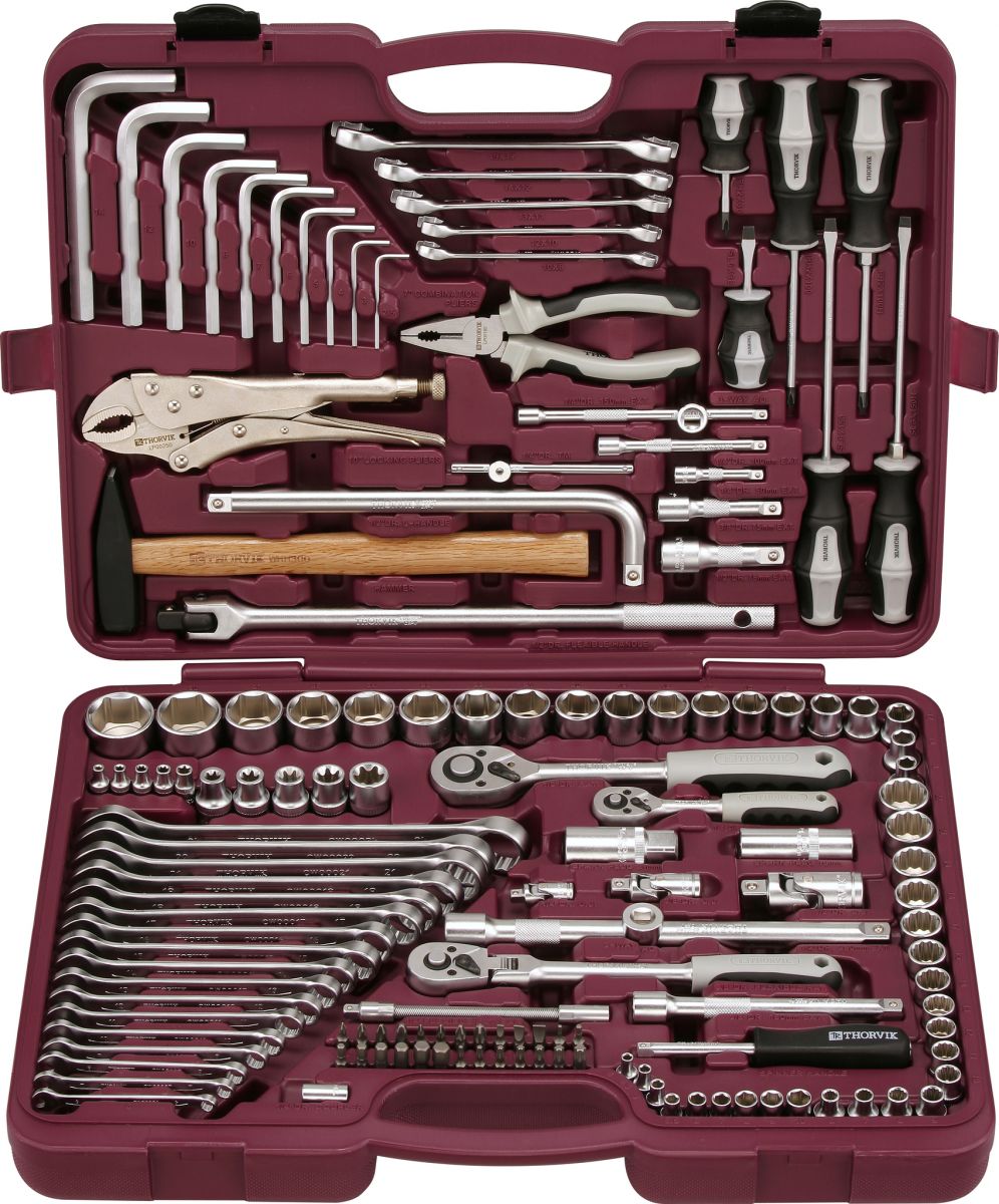 Состав Головки торцевые 1/4"DR, 9 шт.: 4, 4.5, 5, 5.5, 6, 7, 8, 9, 10 мм Головки торцевые 1/4"DR внешний TORX®, 5 шт.: E4, E5, E6, E7, E8 Трещоточная рукоятка 1/4"DR: 150 мм, 48 зубцов Вороток т-образный 1/4"DR: 110 мм Шарнир карданный 1/4"DR: 35 мм Удлинители 1/4"DR, 3 шт.: 50, 100, 150 мм Гибкий удлинитель 1/4"DR: 150 мм Отверточная рукоятка 1/4"DR: 150 мм Адаптер для вставок-бит 1/4"DR х 1/4"НDR: Вставки-биты 1/4"HDR L=25 мм, 26 шт.: (РН) 0, 1, 2, 3; (PZ) 0, 1, 2, 3; (SL) 4, 5.5, 7 (H) 2, 3, 4, 5, 6, 7, 8, 10 мм (T) Т10, Т15, Т20, Т25, Т27, Т30, Т40 Головки торцевые 3/8"DR, 15 шт.: 6, 7, 8, 9, 10, 11, 12, 13, 14, 15, 17, 18, 19, 21, 22 мм Трещоточная рукоятка с гибкой головкой 3/8"DR : 250 мм, 48 зубцов Удлинители 3/8"DR, 2 шт.: 75, 150 мм Шарнир карданный 3/8"DR: 50 мм Адаптер трехсторонний: Головки торцевые 1/2"DR, 19 шт.: 8, 10, 12, 13, 14, 15, 16, 17, 18, 19, 20, 21, 22, 23, 24, 25, 27, 30, 32 мм Головки торцевые 1/2"DR внешний TORX®, 5 шт.: E10, E12, E14, E16, E20 Головки свечные 1/2"DR, 2 шт.: 16, 21 мм Трещоточная рукоятка 1/2"DR: 250 мм, 48 зубцов Вороток гибкая рукоятка 1/2"DR: 375 мм Вороток г-образный двусторонний 1/2"DR: 250 мм Удлинители 1/2"DR, 2 шт. : 75, 250 мм Шарнир карданный 1/2"DR: 70 мм Адаптер трехсторонний 1/2"DR: Ключи комбинированные, 17 шт.: 6, 7, 8, 9, 10, 11, 12, 13, 14, 15, 16, 17, 18, 19, 21, 22, 24 мм Ключи разрезные, 5 шт.: 8х10, 10х12, 11х13, 12х14, 17х19 мм Ключи торцевые шестигранные, 10 шт.: 2.5, 3, 4, 5, 6, 7, 8, 10, 12, 14 мм Отвертки 6 шт.: (РН) 2х38 мм, 2х100 мм, 2х100 мм (ударная) (SL) 6х38 мм, 6х150 мм, 6.5х150 мм (ударная) Молоток : 0,3 кг Пассатижи : 175 мм Ручные тиски : 250 мм